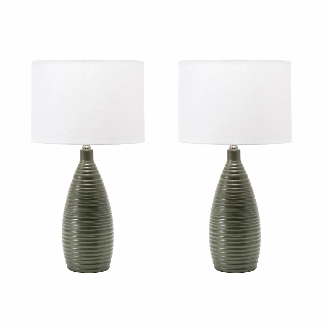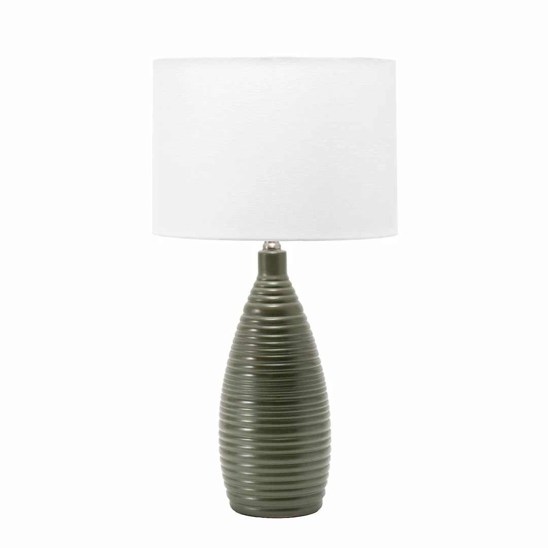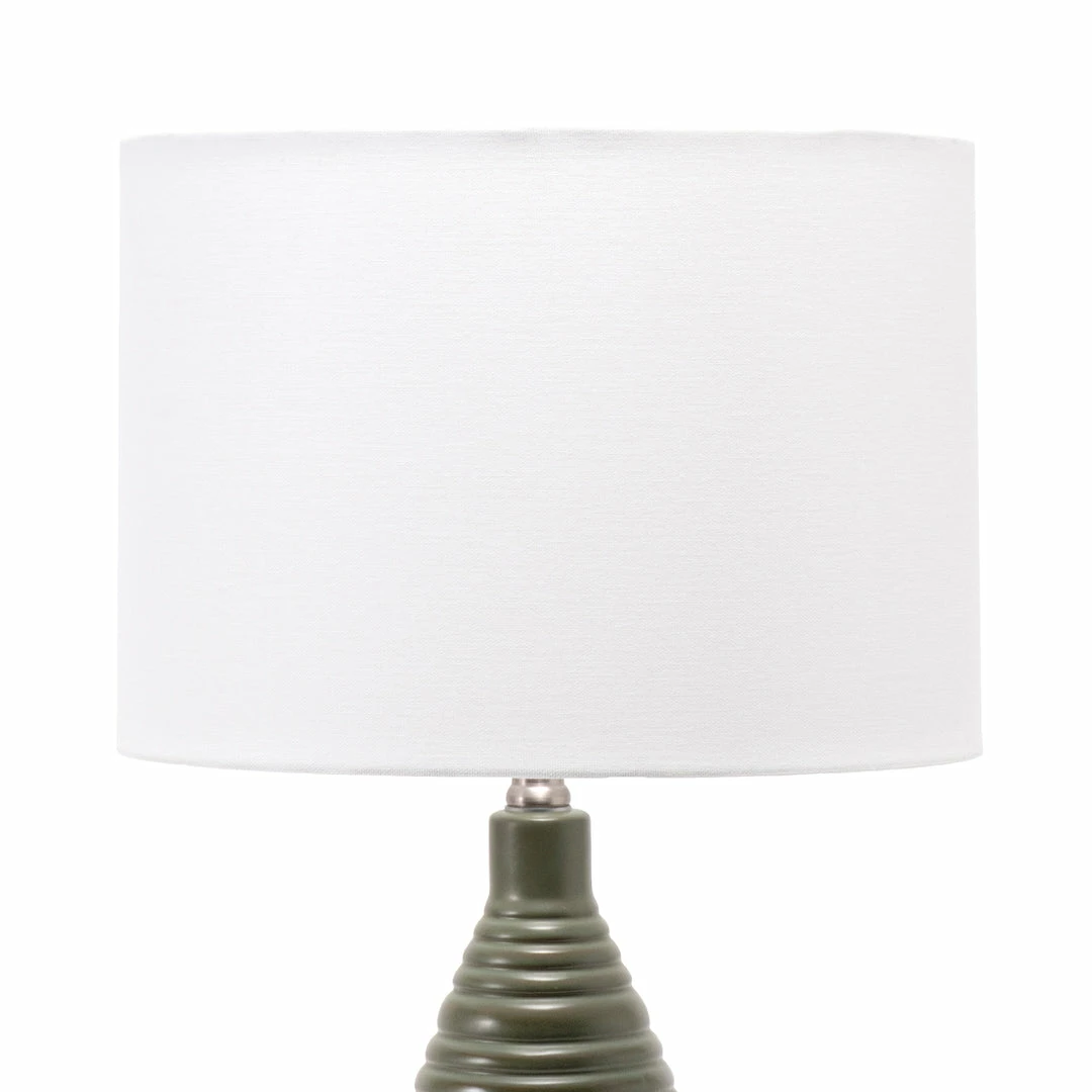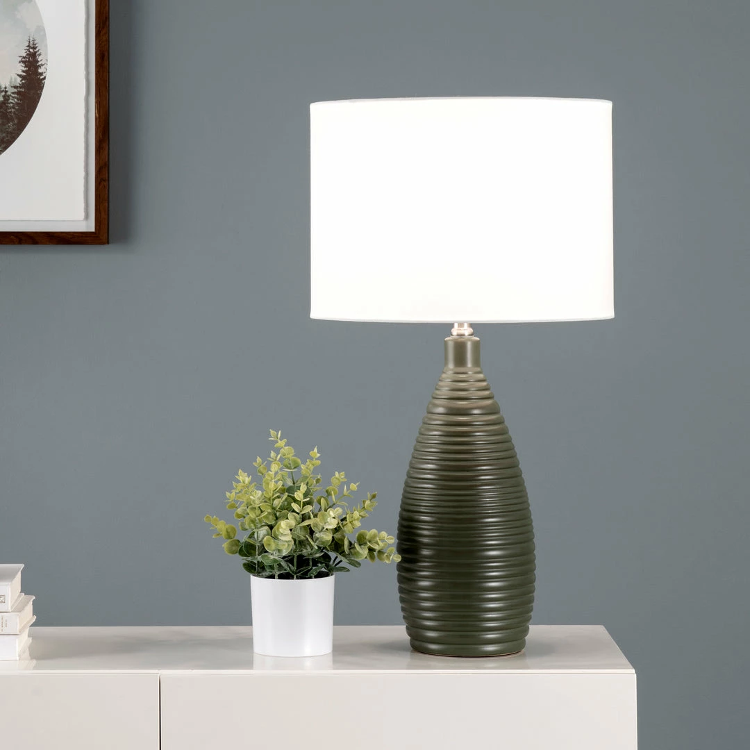 Let your room shine with the addition of this modern, 26-inch high, ceramic table lamp. It has a white fabric drum shade that delivers ambient lighting and will add a vibrant flair to any room.