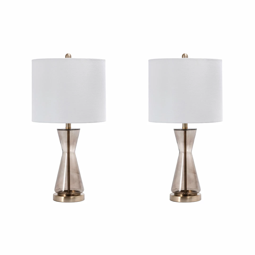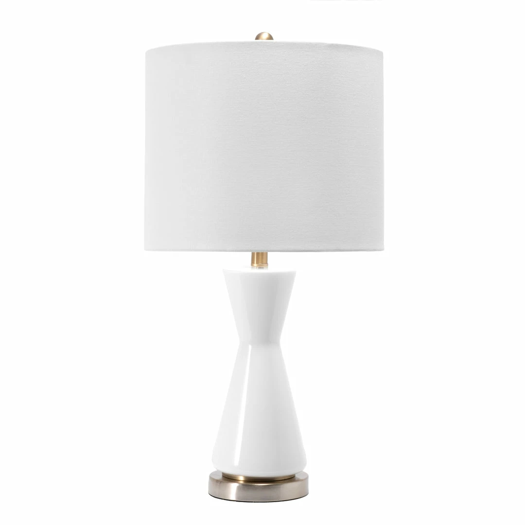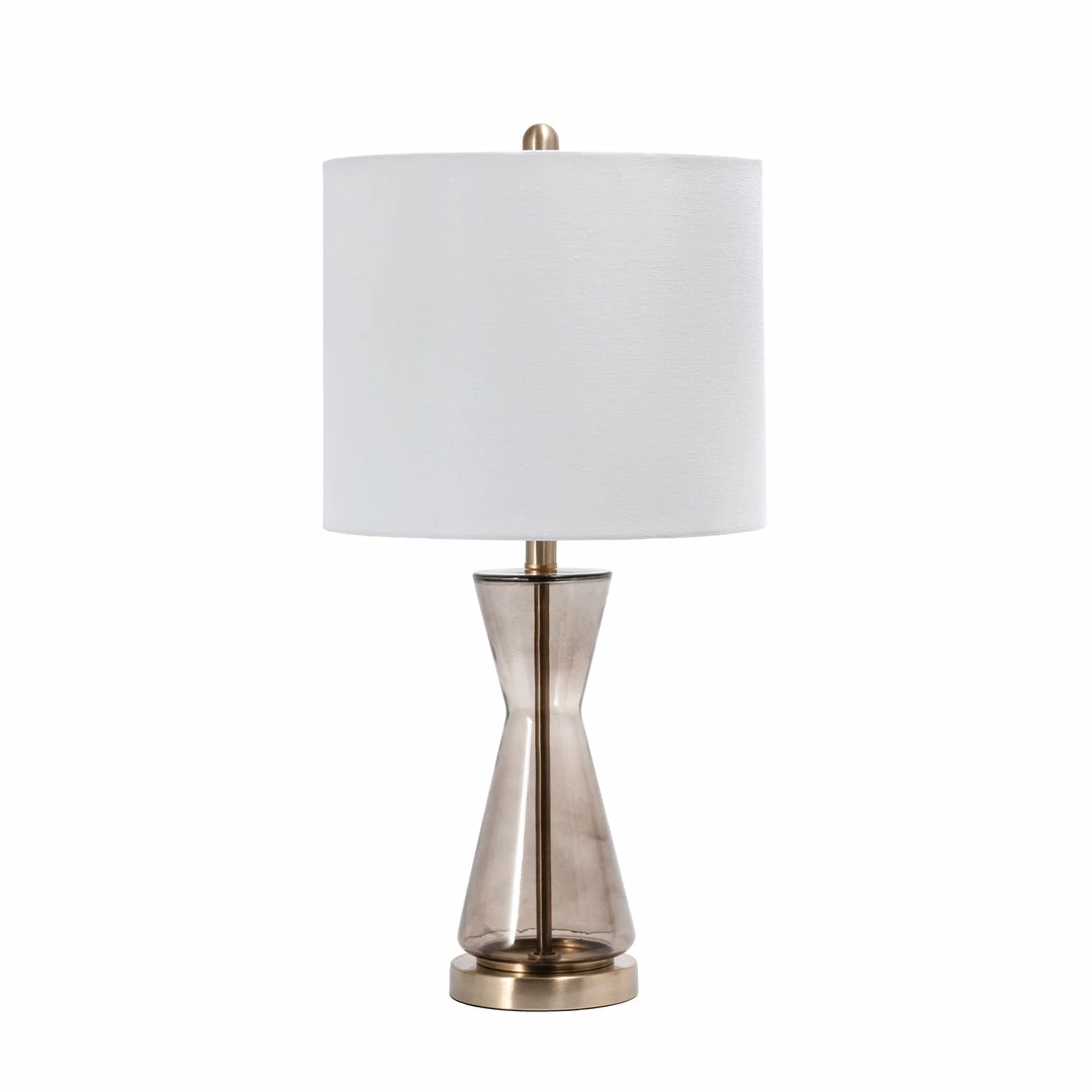 Warm and luminous, with a modern hourglass base, this lamp will make a refreshing and stylish addition to your space. The cloth shade diffuses the light beautifully for ample illumination, and the glass body provides a sturdy base.