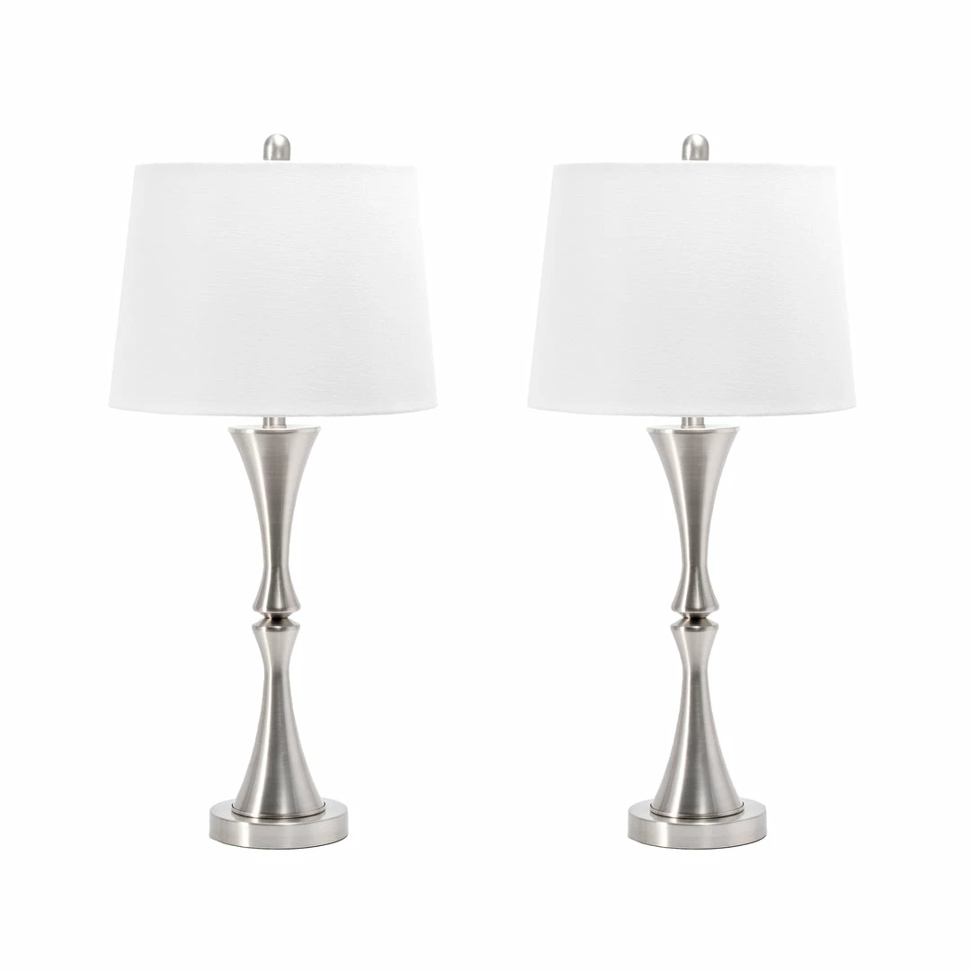 Light up your living space with this traditional style lamp set. Crafted of durable metal, the lamp’s hourglass base provides a sturdy structure to ensure years of use. The cloth empire shade perfectly diffuses ample lighting, and the convenient rotary switch makes the lamps easy to control. This set of two will help balance out your nightstands or end tables.