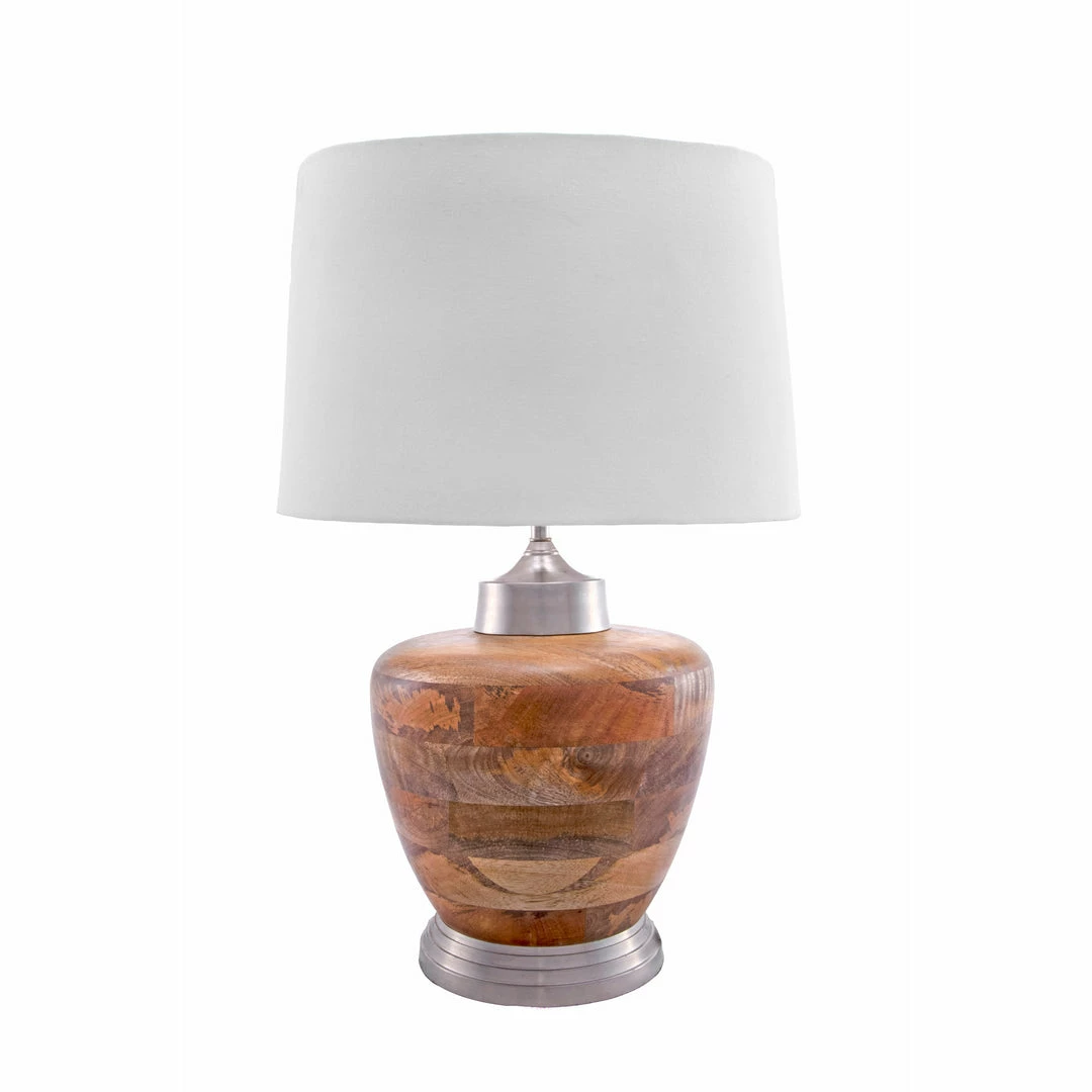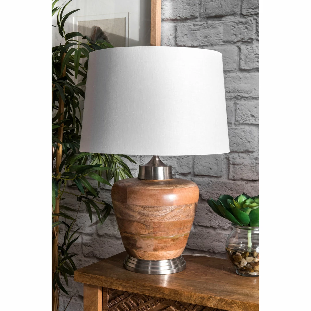 Let your room shine with the addition of this modern, 21-inch high, Aluminum & Wood table lamp. It has a Cotton shade that delivers bright ambient lighting. Add an vibrant flair to any room with its Nickel finish.