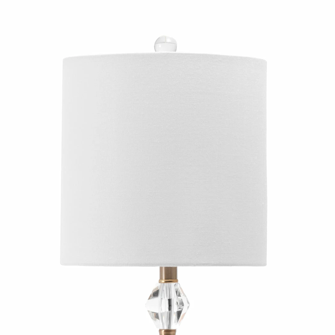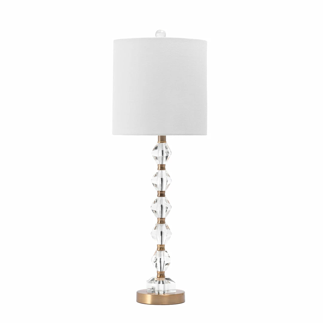 Top off a side table with a decorative transitional style table lamp. A 29-inch tall crystal stacked base will fit easily onto your table, desk, or nightstand. A simple fabric tapered drum shade pops on the top of this lamp easily, creating a balanced look with diffused light.