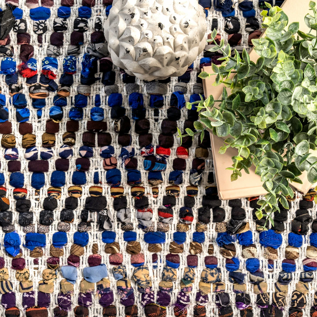 Brighten your room with this distinctively vivid bohemian area rug. This colorful floor covering will pair seamlessly with any of your existing dΓ©cor from Moroccan to modern. Hand crafted from a blend of polyester and cotton in India, each piece carries with it a variation in color and pattern unique to the artisan who wove it. Because of the handmade nature of these rugs, no two will look exactly alike and will be unique to your home. Never settle for less than what you deserve with our pet-friendly and easy to care for area rugs.