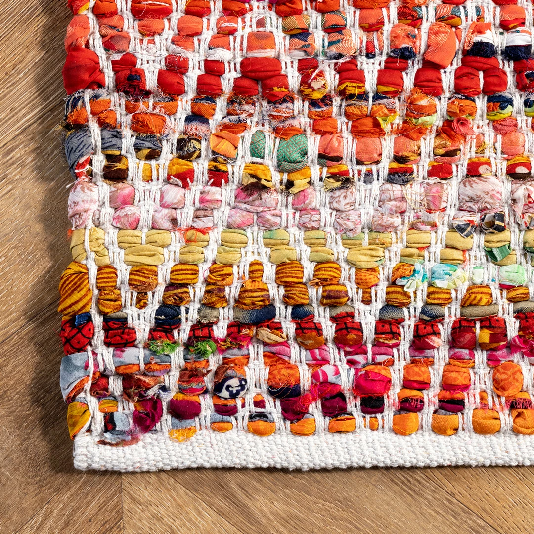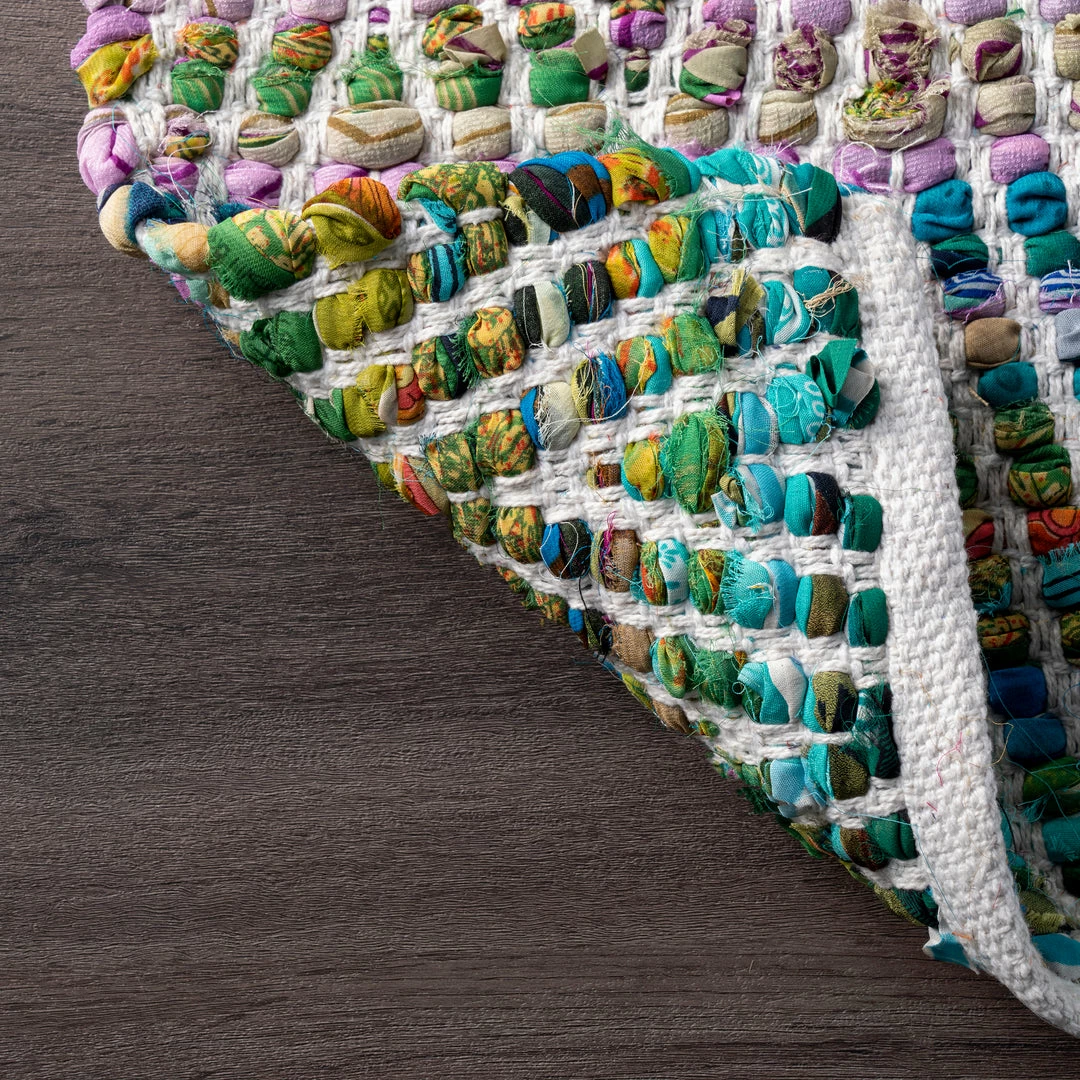 Brighten your room with this distinctively vivid rug. Hand crafted in India, each piece carries with it a variation in color and pattern unique to the artisan who wove it. Because of the handmade nature of these rugs, no two will look exactly alike.