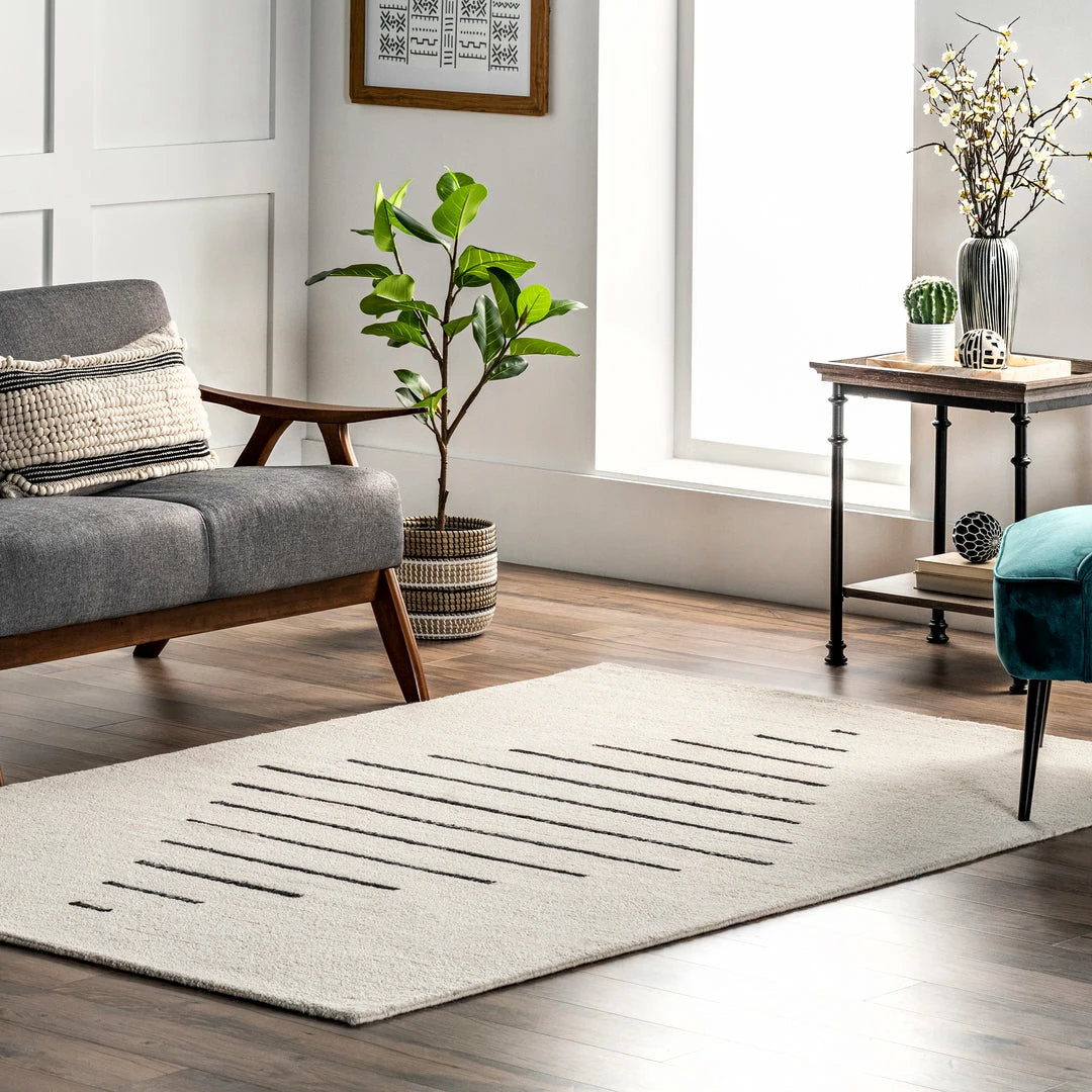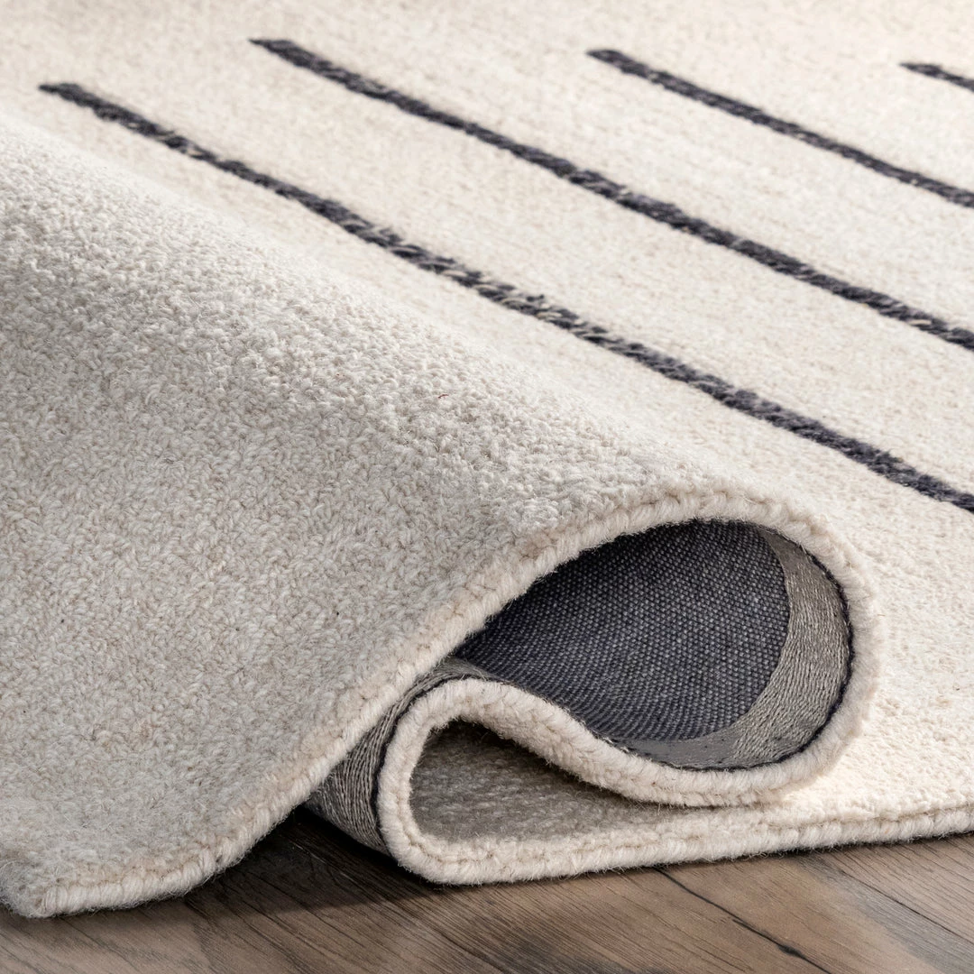 Handcrafted with warm wool and soft cotton yarns, this rug features a soft texture and contemporary minimalistic style. Clean, repeating lines form a diamond pattern that gives the rug character. This rug will make any space feel like home while pairing seamlessly with almost any decor scheme.