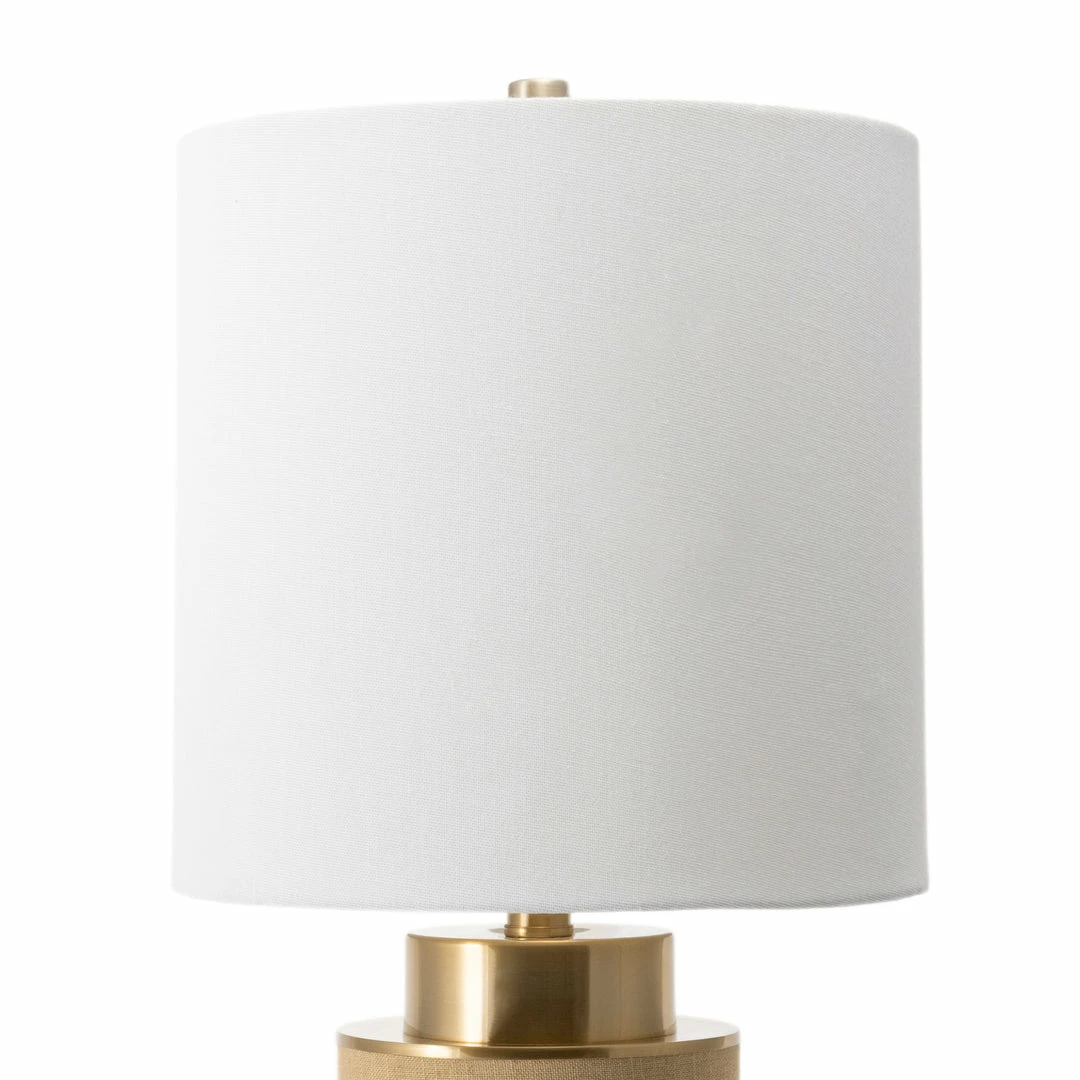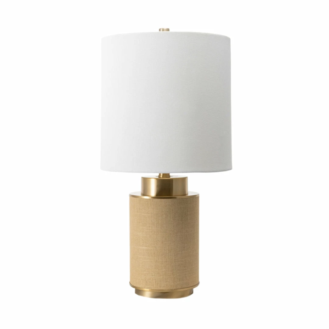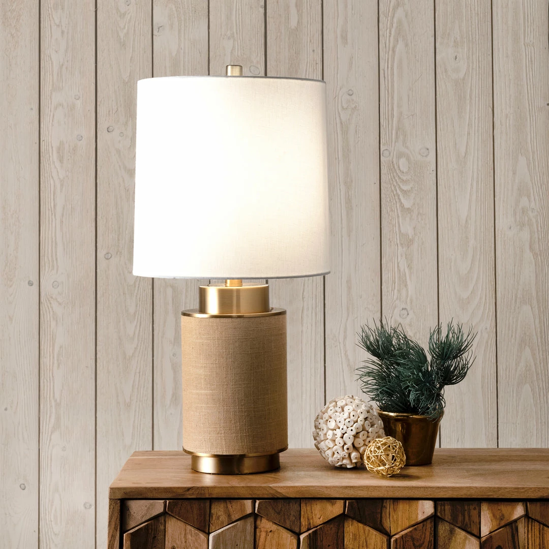 Shed light on any dark corner with this beautiful lamp from nuLOOM. This contemporary Ramona lamp has a up-to-the-minute look with its barrel-style body in a soft beige color. Gold accents give the lamp an upscale presentation on your table or desk, increasing its wow factor while you read or do needlework. A pretty, white cotton fabric shade tops the lamp and diffuses gentle light where it’s needed while giving the lamp a two-tone look that meshes well with modern decor.