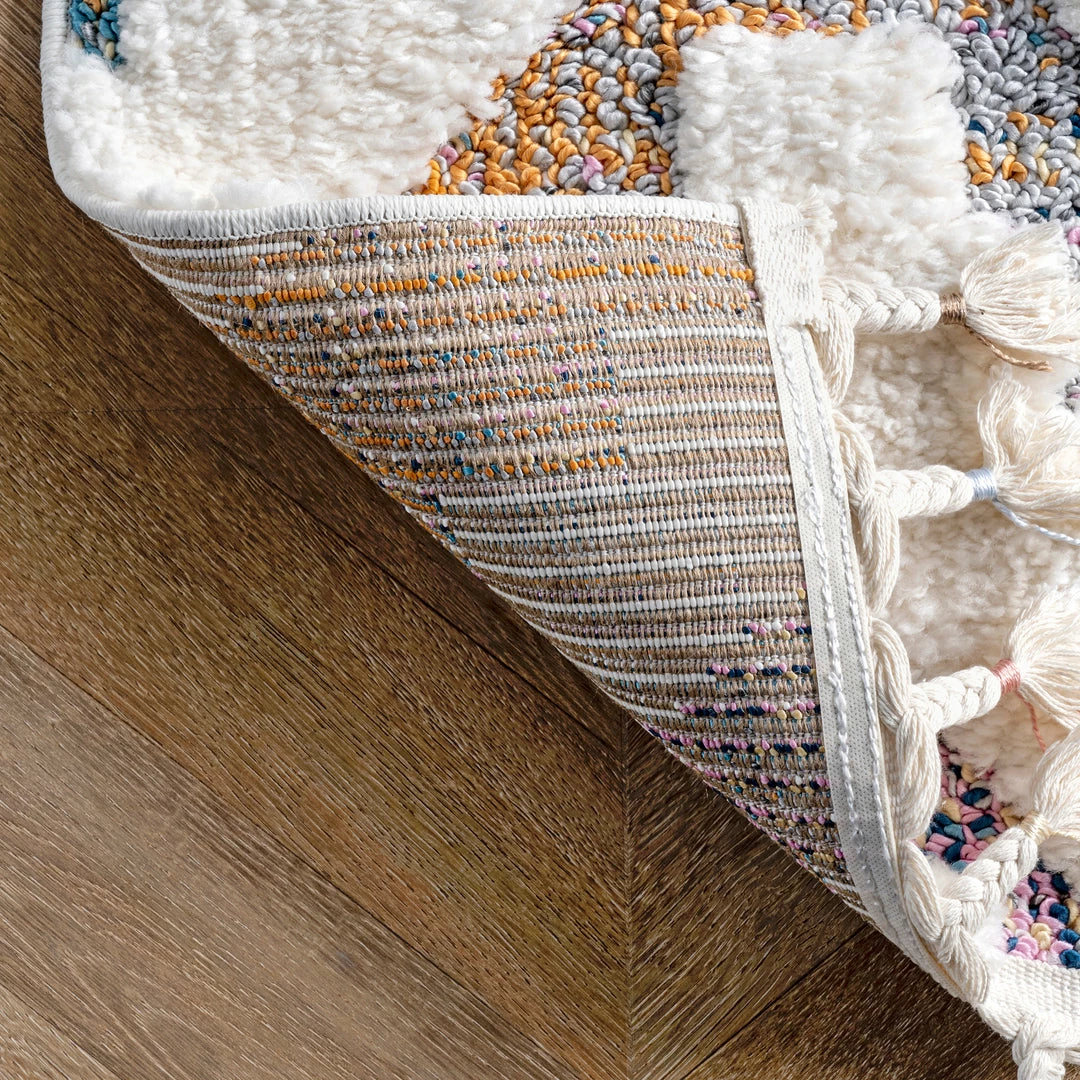 Both children and adults alike are bound to fall in love with this beautiful cozy textured area rug. Not lacking a single detail this rug features a fun creative pattern, bright pops of color, and braided tassels. It will make the perfect addition to a playroom, nursery, or bedroom. Prized for their durability and ease of care, synthetic rugs are the perfect choice when spills and constant foot traffic are at the top of your mind.