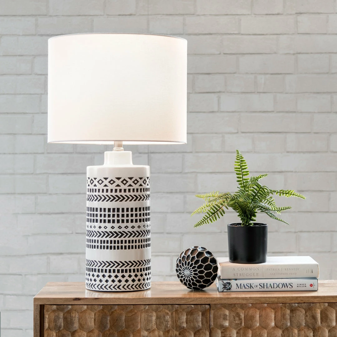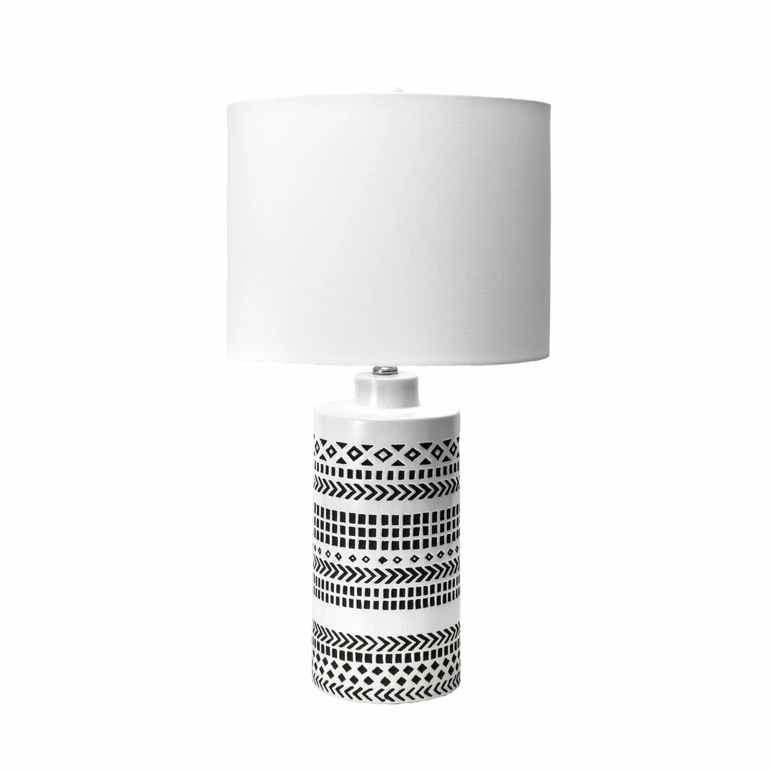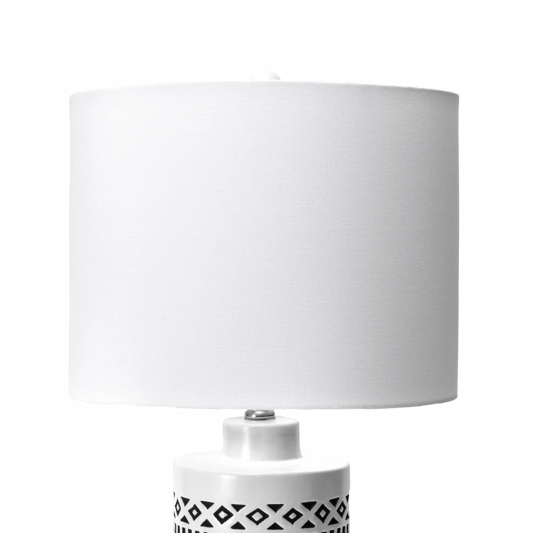 Introduce your bedroom to contemporary charm when you choose the Yuma table lamp. Featuring a tall, cylindrical, ceramic base, etched with geometric patterns, this lamp gives your room instant panache. A crisp, white, linen, drum shade sits atop the base, carefully ensconcing this lamp’s single bulb and diffusing soft light for reading or to illuminate your room. Globally-inspired motifs and a smooth, white finish lend this lamp sophistication, while its on-off, rotary switch is easy to operate and offers convenient lighting control.
